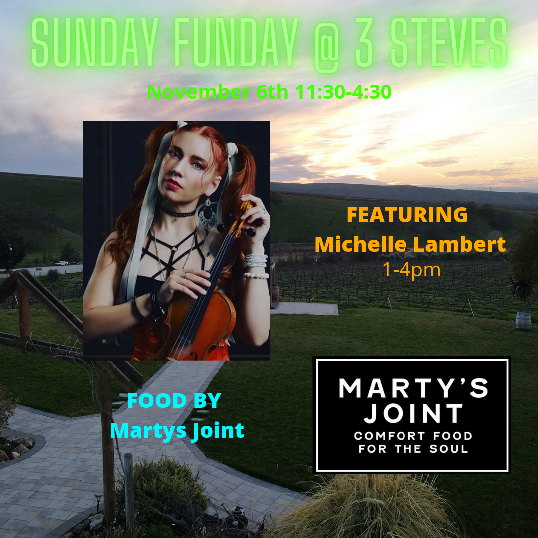 3 Steves Winery 5700 Greenville Road, Livermore, CA, United StatesHey 3 Steves Family, we have another great Sunday funday planned for you. With Music by the super talented vocalist and multi-instrumentalist Michelle Lambert and amazing comfort food by Martys Joint this is surely not a day you want to miss! For more info on Michelle Lambert please Visit: Michelle Lambert For more info on […]